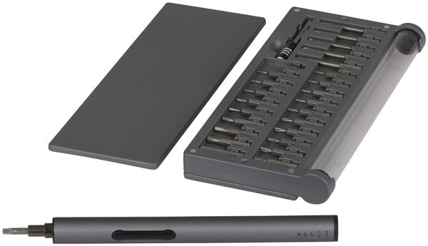 This precision electric screwdriver is ideal for makers, technicians, and other professionals who are assembling or repairing phones, watches, laptops, drones, and more. The lightweight and slim anodised body is a pleasure to hold, and tactile switches enable you to easily toggle between clockwise and counter-clockwise using your thumb or fingers. Integrated LEDs shine light on what you’re working on, and five LEDs at the other end of the screwdriver indicate the power remaining. To recharge, simply connect to a USB power source using the supplied USB lead. A tool magnetiser/demagnitiser is included to enable the bits to hold onto the screws, and a handy magnetic work mat prevents tiny nuts and bolts from rolling off your workbench while you work. 55 x S2 tool steel bits, including tamperproof types, are supplied, along with an extension rod,  and handy carry case. A worthwhile investment for every workbench or toolbox.
