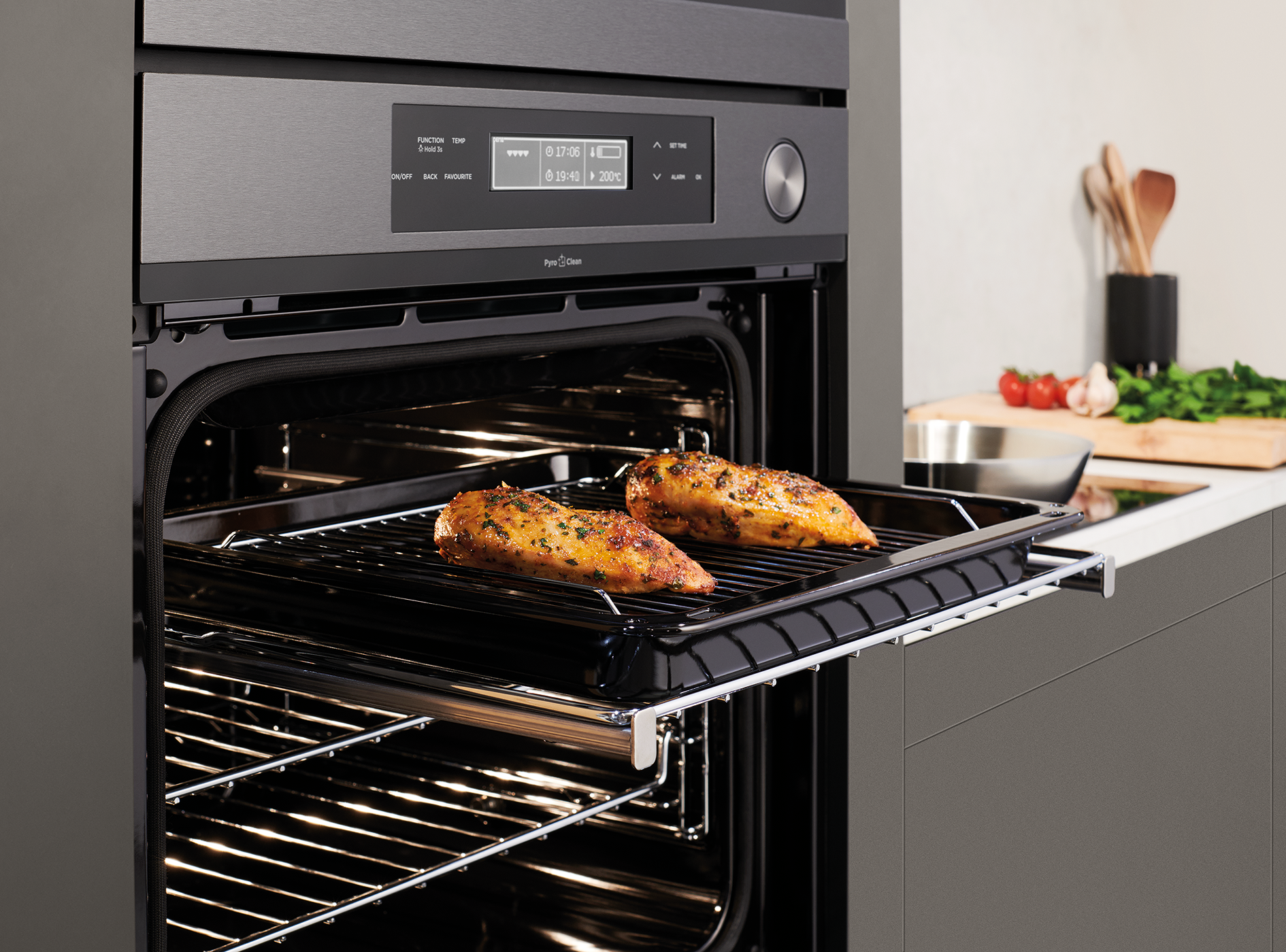 为方便和安全而设计伸缩跑道.PNG 伸缩滑轨是另一种贴心的设计,可以轻松拉出架子并在烹饪过程中安全地检查菜肴。